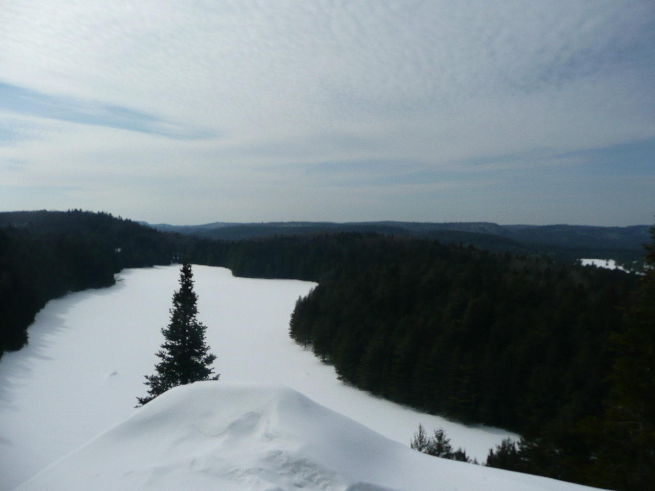 Although we’d decided originally we were going to pack everything up and make the next 9km we’d come to the new conclusion that we’d leave the camp where it was and simply take a long day hike. The benefit, no heavy packs and we might as well make use of the fact that we can walk across the lake to any destination, a luxury only afforded when winter camping. It was also +1 degree with a clear blue sky, today was meant to relax. We slept in until about 10am and ate a hearty breakfast of oatmeal before taking off for one of the highland’s lookout points on the Eastern point of the blue loop. After a wrong turn and quick detour we arrived to see a beautiful expanse and eat enough Lipton Sidekicks for 12 people under a hot sun. During our walk we’d bumped into 6 guys on their 12th annual trip, who had even decided to bring in cans of beer on sleds, we knew they were beauties. Once we returned we decided our woodpile needed tending too, so we each took turns