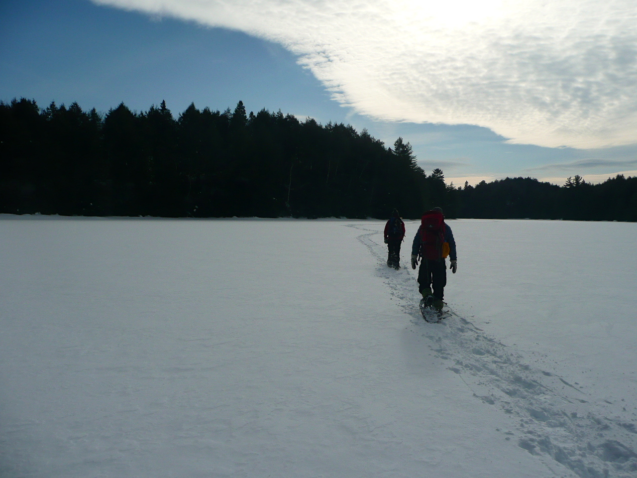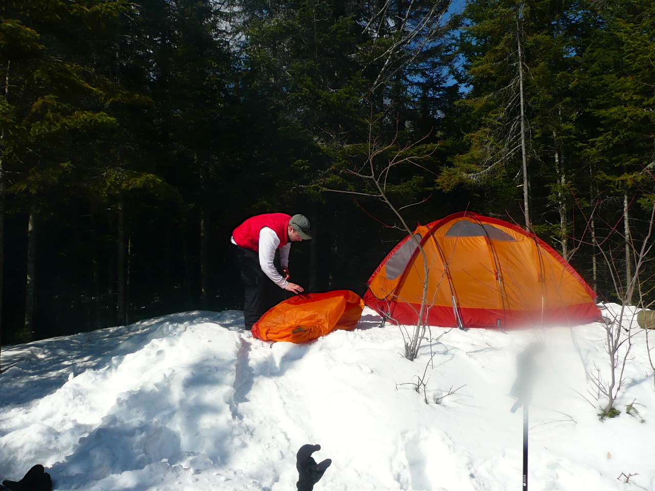 We had our snowshoes and backpacks strapped on and took off at around 1pm. Our plan was the blue 19km loop in 3 days, which I figured easy since I’d completed the yellow 35km loop in 3 days this past Autumn. While in the fall you are amazed by the vast array of colours, the winter offers its own beauty in the pristine nature and sense of solitude you feel being surrounded by so much white. Although the beginning of the highland trail offers a few steep climbs, the initial 5.6km can be accomplished in roughly 2 hours time. We had picked a perfect day, -7 and completely blue skies, it certainly livened the winter drawls. Before we knew it we’d reached where we’d planned to camp and decided to get everything set up.
