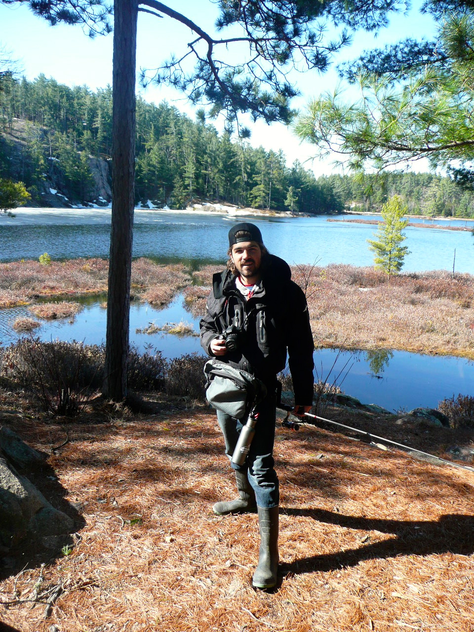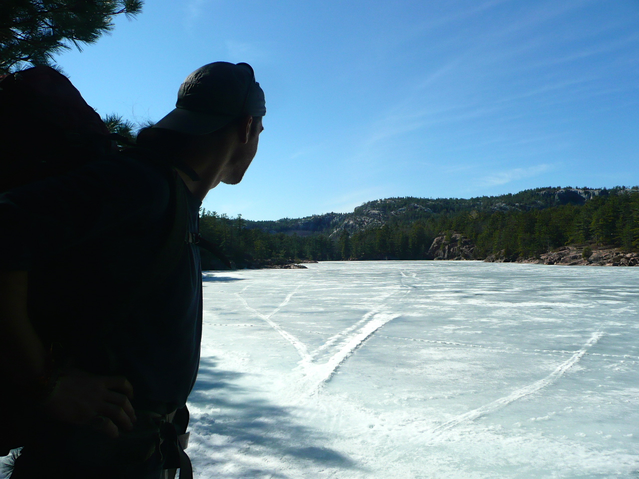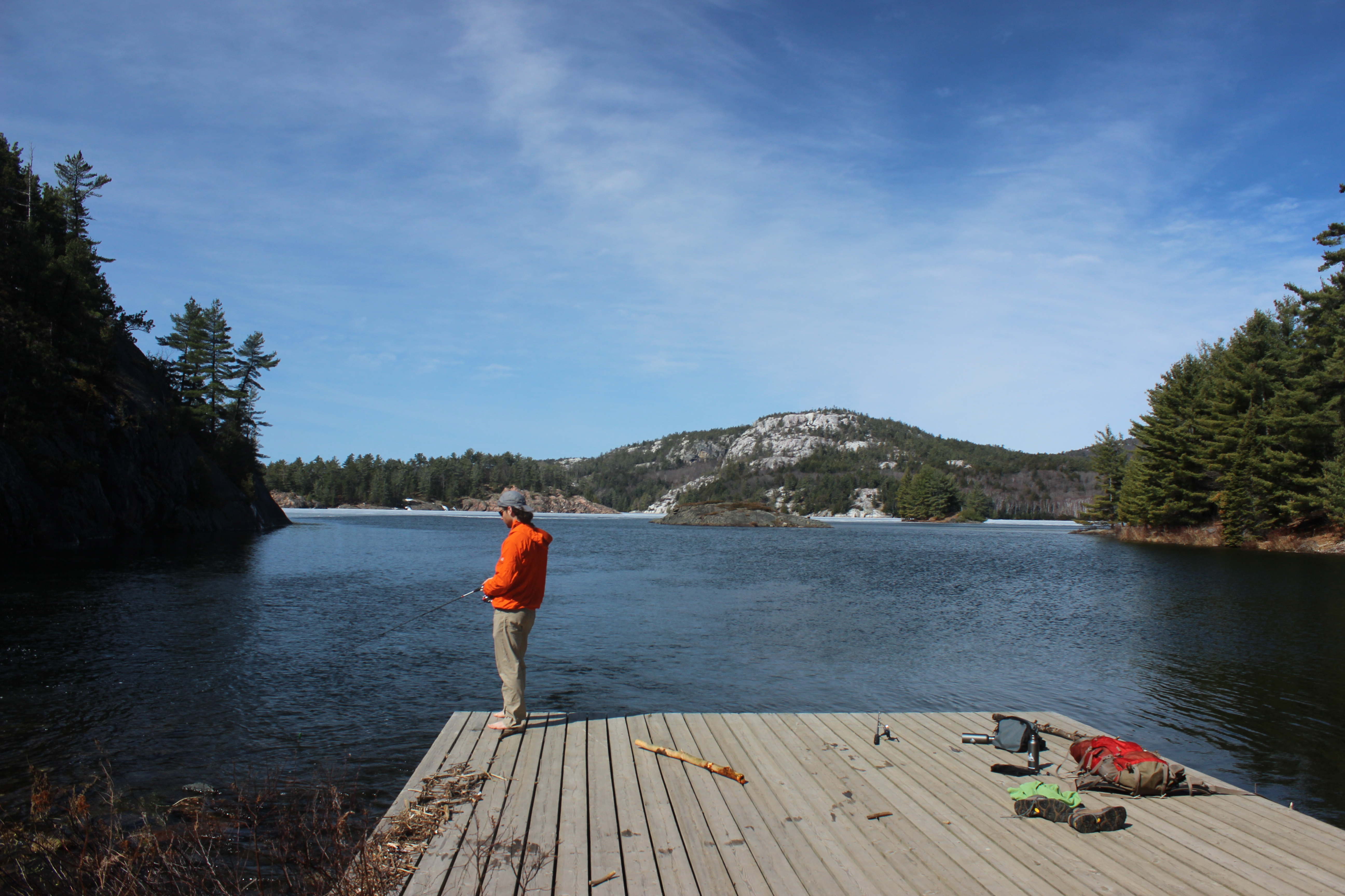 Our minds were on the fishing, and we talked about the past luck we’d had in the area, and the strategy for early spring fishing. When we came across the first large lake we realized a fact we’d slightly overlooked… the lake was still completely frozen, and impossible to cast into. Still, we we’re confident that we’d find a way, so after a short hour jaunt where we took many breaks to take in how beautiful Killarney really is, we finally made it to our campsite on Hagon Lake, and got settled. A healthy dose of whisky and fireball, pasta cooked for a family of 5, and a deck of cards quickly allowed the night the settle in and the day came to a close. I couldn’t believe we’d actually made it out here.