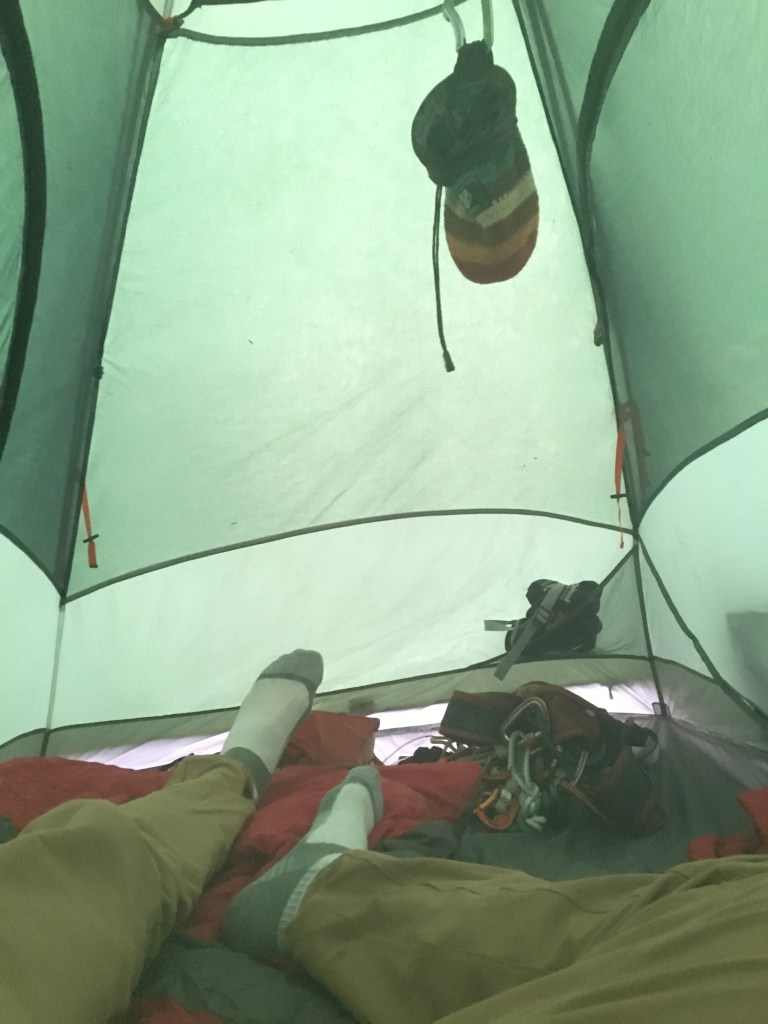 All that was left to do was pull the rope and climb up the bolted sport route (a 4-star 5.10a). I grabbed the right stand and gave it a tug… nothing. I then yanked it… again, nothing. With all my body weight this time… and nothing. The rope was pinched. This means a few things. 1. You can’t pull the rope to rappel any further to safety 2. Your can’t climb up the rope on lead or top-rope to climb the rope 3. You’re stuck. So our very first time climbing at Lion’s Head we pinched the rope on our first route. On a hanging belay that neither of us had ever been on, after 2-days of constant rain. It was a laughable situation. Luckily, our buddy had leant us his ascender (which we’d never used before), and that coupled with a couple tension knots and a locked-out ATC and I was climbing my 9.8mm rope up to safety.