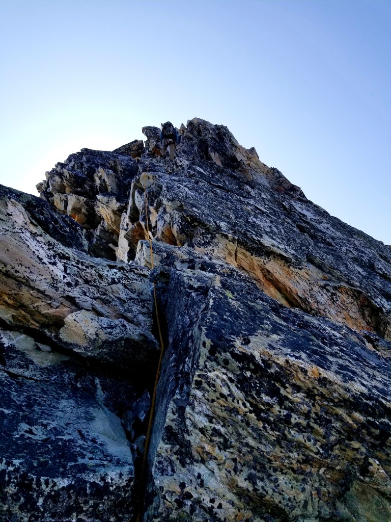 The climbing was magnificent. Solid and blocky quartzite rock is easily protectable and confidence inspiring as you literally stay directly on the ridgeline. Veering off the Northwest ridge even slightly almost immediately gets you into more difficult terrain – while still enjoyable, it’s easiest to stick true to the ridgeline. Time went into a vacuum as we continued to propel our bodies using our hands and feet up the rock monolith. We swapped leads every 15 minutes or so, depending on how long the rack of protection would last.