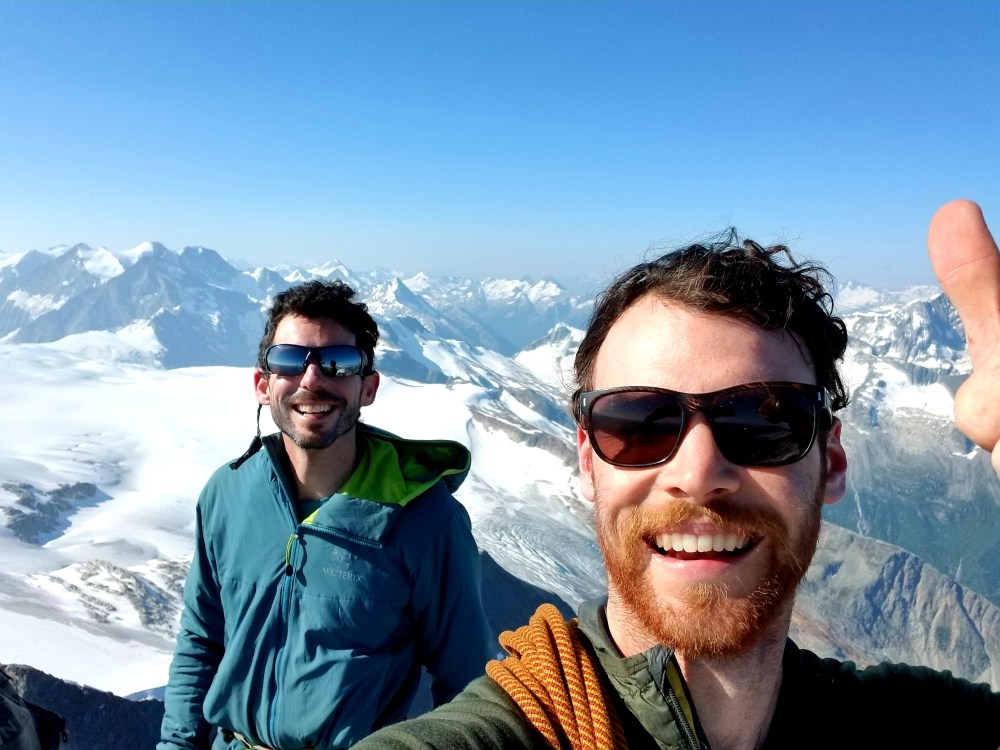 Under a perfectly clear blue sky we reached the summit proper (3284m), being the first party to do so that day (We’d past the other 3 parties before the rappel stations). Settling in to a meal of granola bars and dried fruit we took our time to enjoy the Selkirks Range to the West, the Purcell range to the East, and the saturating feeling of enjoyment that comes from reaching a goal with a good friend.