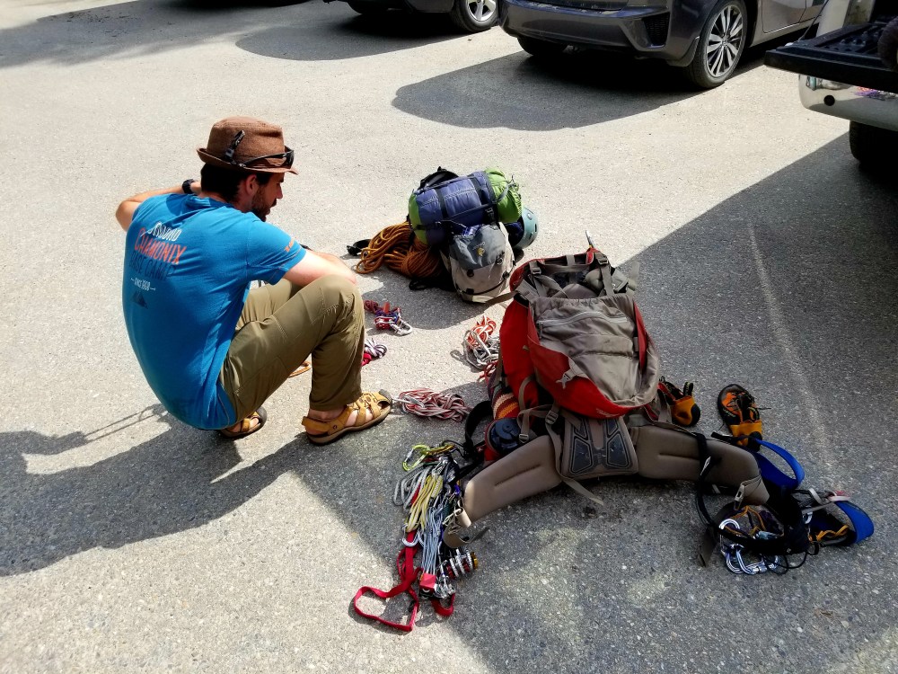 We arrived at the col as the same time as the 3rd guided party that had taken off ahead of us. It was time to harness up, rack our alpine climbing gear, and rope up. Our plan was to simul-climb the entire ridgeline, placing gear whenever we felt difficulty or exposure warranted. Simul-climbing differs from the conventional style of ‘pitching it out’ since both members move together at the same time – versus having one person belay as the other climbs and places gear. This style has obvious efficiencies of keeping a consistent flow, however, a natural risk with not being on a direct delay. I had never simul-climbed before (or climbed any mountain for that matter) so I felt a bit green learning how to coil the rope properly around myself and set up a safe rope system between ourselves. However, my experience in climbing in general lent itself to understanding rope management systems.